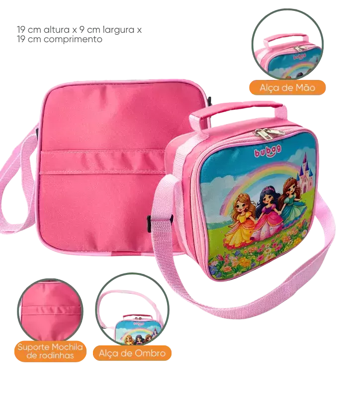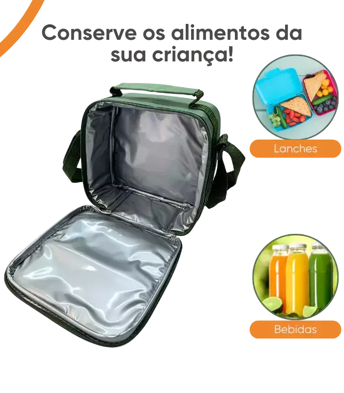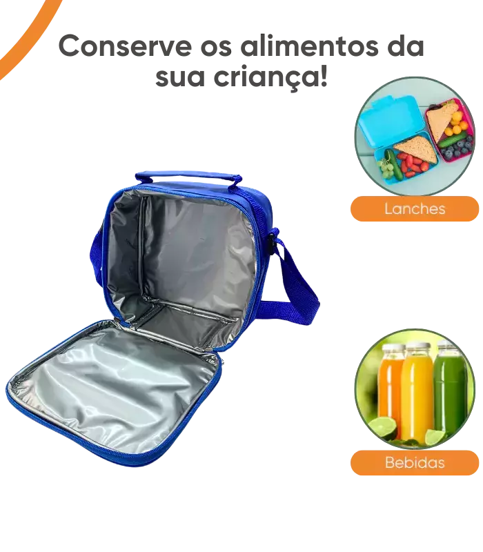 Confeccionada em nylon resistente na parte externa, com manta e forro de laminado PVC na parte interna para manter os alimentos dos pequenos frescos e conservados por mais tempo,